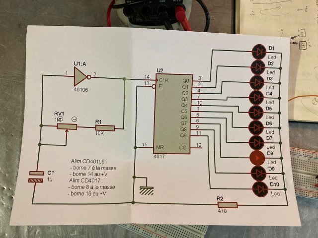 La partie droite du schéma permet de réaliser la cascade de LEDs que nous avons vue précédemment pendant la présentation de l’installation qu’Alexis construit. Il serait possible de réaliser cette partie du circuit ultérieurement. La partie gauche du schéma sert d’horloge pour la cascades de LEDs. En tournant le potentiomètre, on module la vitesse d’oscillation du circuit, faisant avancer plus ou moins rapidement la cascade de LEDs.
