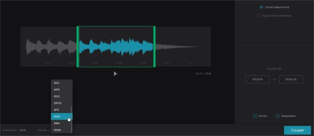 vous permet de délimiter précisément un passage et d’en extraire l’audio. Fondus en entrée et/ou sortie sont proposés, tout comme différents types de fichier pour l’export (WAV, MP3, AAC, WMA...).