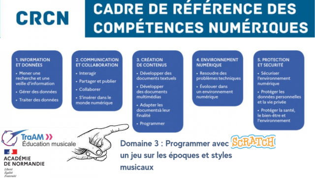 En s’appuyant sur la compétence "Écouter, comparer, commenter, construire une culture musicale commune" (programme d’éducation musicale, cycle 4), les élèves s’aideront de capsules pédagogiques élaborées par les enseignants afin de déterminer les caractéristiques principales de styles musicaux de diverses époques. Il s’agira de constituer une banque d’images correspondant aux époques musicales afin de proposer des repères chronologiques s’appuyant sur les différentes esthétiques étudiées en histoire des arts puis de constituer une banque de données regroupant des extraits musicaux chronologiquement référencés. Les élèves programmeront dans Scratch un jeu dont le principe consistera à tirer au sort une image pour la faire ensuite correspondre à un extrait musical se référant à cette époque, en effectuant un choix guidé par un certain nombre d’indices proposés dans les paramètres de programmation. Ils devront élaborer la règle du jeu. Les indices, images et extraits sonores seront constitués par les élèves sur la base des recherches menées avec l’aide des enseignants. Une fois le jeu finalisé, il pourra être déposé après compilation sur les Espaces Numériques de Travail et proposera aux élèves des cours ludifiés en réseau au sein des différents établissements ou en distanciel. Le résultat de cette programmation pourra ainsi être mutualisé afin d’offrir un outil d’apprentissage ludique et attractif des esthétiques musicales.
